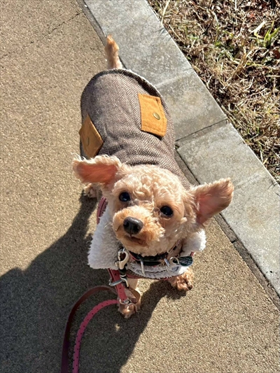 繁殖場から来た子に有りがちなことですが、最初のうちは屋外に出ることを怖がりなかなか散歩ができませんでした。しかし毎日のトレーニングで少しづつ周囲の環境に馴染み、近所の犬友やその飼い主さん達とも交友を深め、たくさんの楽しい時間を過ごせるようになってきました。